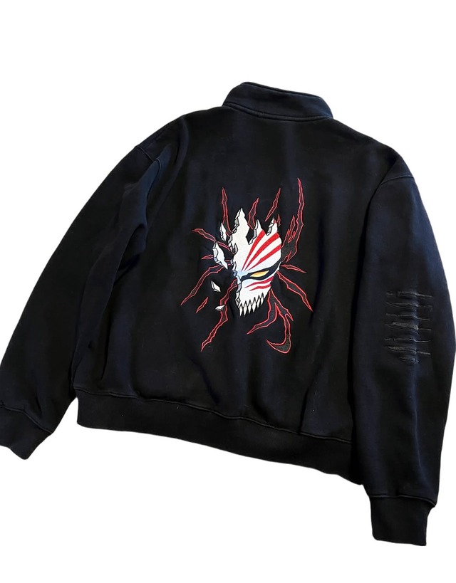 Tシャツは偶に出ても、 ハーフジップスウェットは中々ないかと バックにはインパクトのある虚化一護の刺繍 袖には斬魄刀、フロントは手形の刺繍 ボディは寒さ知らずな ダブルフェイスばりのしっかりとした肉厚ボディ フロントにはポケットもあります 全体的に良い雰囲気の個体です◎ 着丈66㎝ 身幅65㎝ 肩幅63㎝ 袖丈64㎝